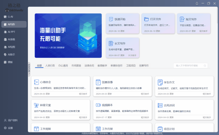 格之格GS80 AI Pro拥有100+AI助手,覆盖了目前大多数的场景和职业。简历、海报、通知、合同、人力资源、总结、财务、文书等无论是写作、表格、PPT都有很丰富的模板可以使用。