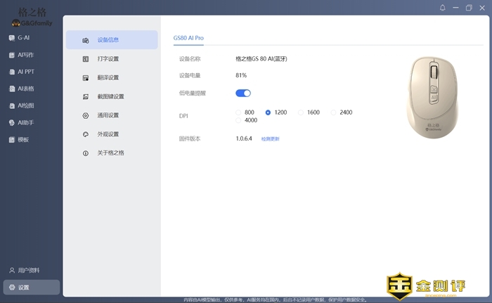 格之格GS80 AI Pro鼠标驱动和AI软件集成在一起很方便下载和使用。驱动方面可以显示设备电量信息、设置DPI、固件升级、打字设置、翻译设置、截图健设置和一些AI相关的个性化设置。其它模块就是我们比较期待的AI功能了,整个驱动软件简介好用易上手。