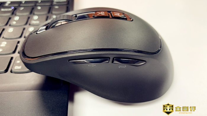 鼠标底部采用对称式设计,脚垫的位置和鼠标底部有一定的镂空设计可以减小摩擦,在使用过程中更加地顺滑,同时底部采用大面积的格栅设计很时尚好看。按键区域集中在中间部位从上到下依次是工作指示灯、开关、光学引擎、模式切换键支持2.4G、蓝牙1、蓝牙2之间切换,底部为2.4G接收器收纳区。
