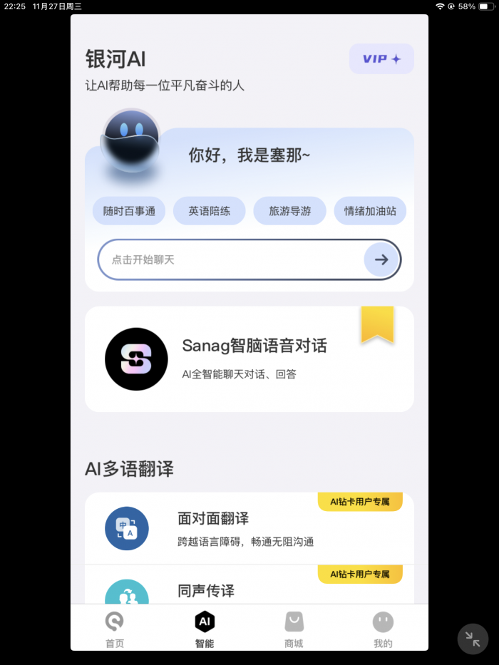 点击进入Sanag智脑语音对话功能之后发现这是一个和智能AI对话的功能,当我有疑问的时候,我不需要再通过打字的方式和塞那AI对话,我直接通过语音提出自己的疑问就可以了。当然了,如果觉得自己记不住那么多的语音回答,也可以通过录下来之后自己一点一点的记录。我开始思索,我是不是可以通过这个智能对话功能来提高自己的英语沟通能力呢?