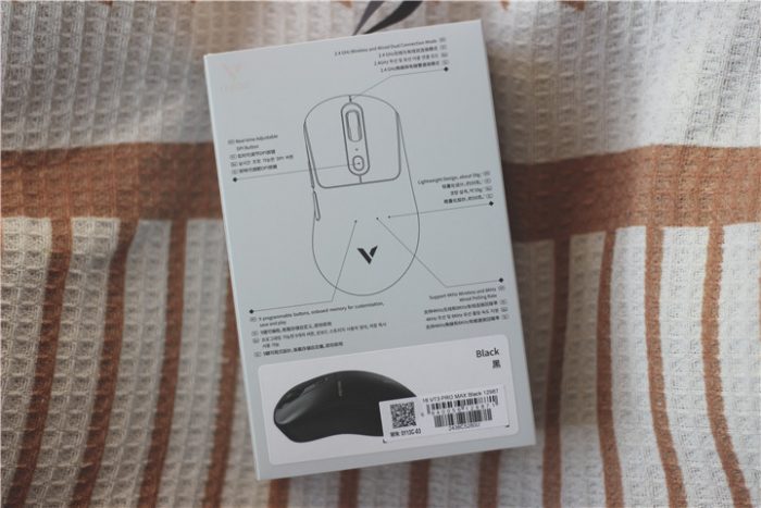 首先我们就是这款雷柏(Rapoo)VT3PRO MAX包装盒的正面发现,PRO、MAX型号字样,就可以确定这款无线鼠标定位为旗舰设备,其次还有支持OTA无线8K+8K有线回报率,可以说配置拉满。