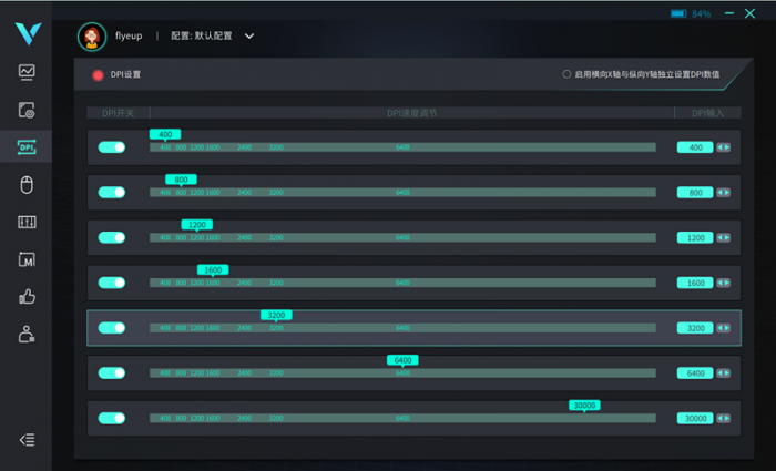 上面说过,除了使用DPI专用按键设置以外,我们还可以通过软件进行更为直观的设置,我比较喜欢用5档也就是3200DPI灵敏度,当然每个的掌控鼠标不一样,可以进行更精细化设置,最高可以达到45000DPI灵敏度。而且支持X/Y轴独立设置,精度10(10-10050)-50(>10050)单位可以调节。满足不同场景化需求。