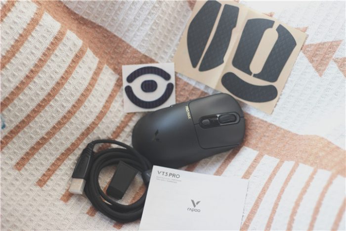 打开包装盒就可以看到这款雷柏(Rapoo)VT3PRO MAX及相关配件,USB数据线、USB A-C转换器、防滑贴、备用替换脚垫、接收器,可以说一款鼠标该有配件都给大满贯。满足你不同场景需求。