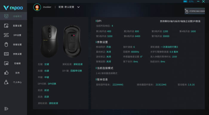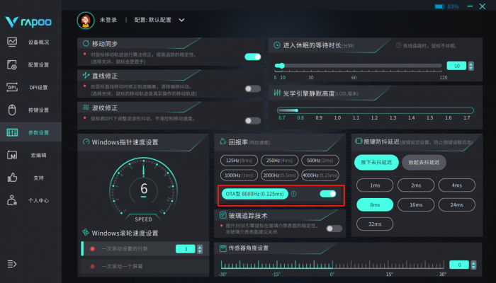 除DPI、回报率、静默高度这些关键数据可调之外,防抖延迟、玻璃追踪、直线修正等功能也都能在驱动中自行调节或开关,雷柏的这个驱动界面也非常友好,各种参数配置开启情况一目了然。