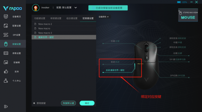 更强大是,雷柏VT3PRO MAX还支持鼠标宏功能,我们可以自己录制或者编写相关的宏命令,然后分配到对应按键,在游戏里就可以一键开启执行,比如格斗游戏里的一键大招,又或者是现在《魔兽世界》大家常用的GSE一键宏自动输出,都可以通过这款鼠标来实现,简直不要太方便!