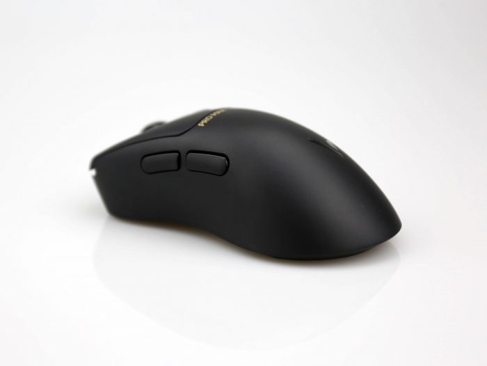 鼠标正面可以看到一个像右倾的弧度,腰部处有内凹设计,用来支撑大拇指,鼠标的左右键也都有导槽,整体外观设计非常符合人体工学设计,使用时可以很好的贴合手掌,支撑效果出色,久握不累。