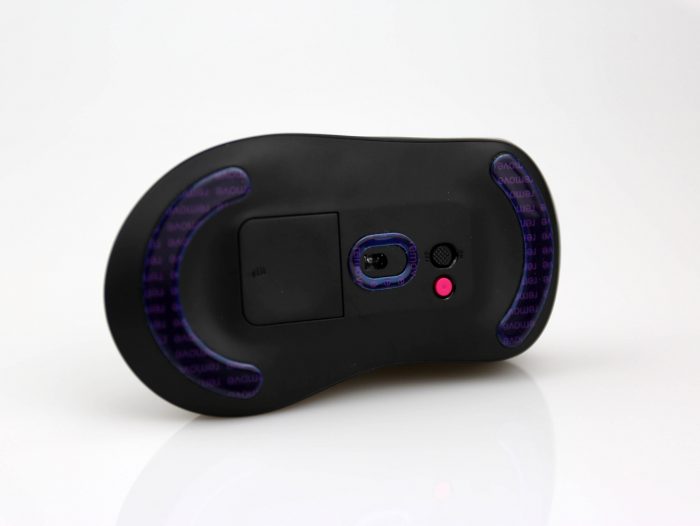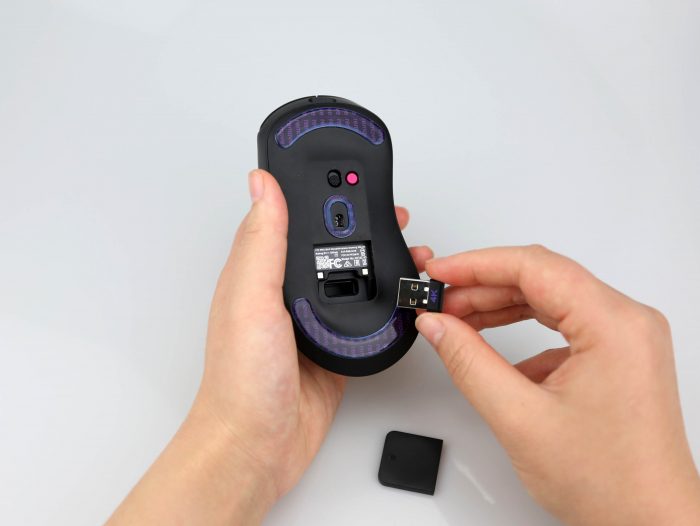 鼠标底部有一个磁吸式收纳仓,用于放置无线接收器,一体式的设计不但便于收纳,也能有效防止丢失,除了无线的2.4GHz连接以外,这款鼠标同样支持插线使用。