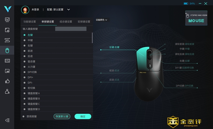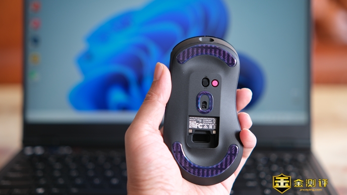 鼠标采用6+1按键方案,除传统左右键、侧键、滚轮、自定义键外,在机身底部还有一个DIY键,总体最多可支持9个自定义按键功能,