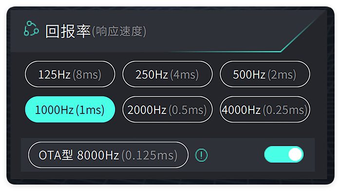 其实这已经不是这款鼠标的亮点性能了,雷柏VT3 PRO MAX无需升级8K接收器就可以实现8K回报率,只需通过驱动程序对应打开OTA型8000Hz回报率即可。通过驱动程序也可以进行回报率的自定义,雷柏VT3 PRO MAX共支持7档可选回报率。