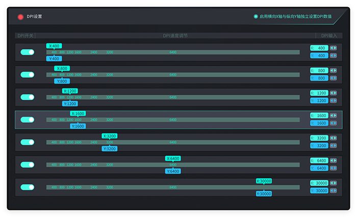 原相3950 ultimate光学引擎还为DPI设置了X/Y轴独立设置功能,可以设置的范围为10-45000DPI。其中在10-10050DPI区间内是以10为单位调节,在大于10050DPI范围里则是以50为单位。同时还提供了750IPS追踪速度和50G的加速度。