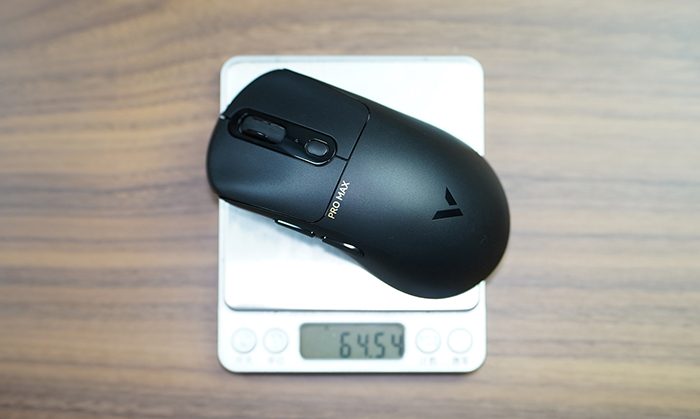 雷柏VT3 PRO MAX除了使用了人体工学设计外形外,还在重量上进行了优化,鼠标本体重约为59g(图片重量包含4K接收器及接收器收纳仓盖),这个重量在中大型鼠标范围里属于超轻级别的了,结合上文提到的人体工学设计,将这款鼠标的手感拉满。