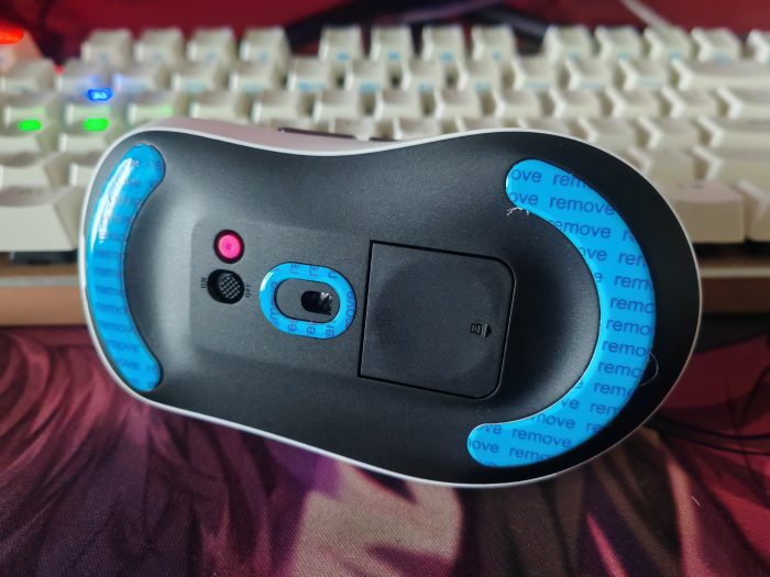 鼠标底部,则是开关按钮、自定键以及接收器收纳槽。如果采用无线USB接收器使用鼠标的情况下,是需要将开关键打开到ON的位置的。当然了,如果是连接的充电线使用,这个开关就不用在意了。我无线使用鼠标的时候,有一个习惯,如果我电脑关机了,那么我也会选择将鼠标的开关键关闭,能够节约电量,让鼠标使用的使用时间更持久一些。