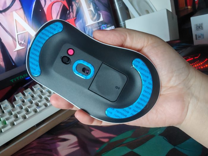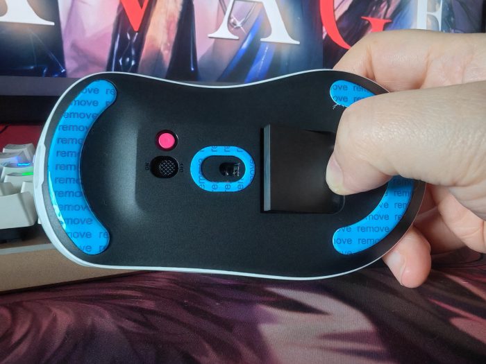 接收器因为磁吸的原因,所以很牢固的呆在接收器收纳槽中,我觉得用手拿每次都不是很好拿接收器出来,所以选择的方法是把接收器收纳槽对着掌心敲一下,然后接收器就水灵灵的自己掉落在我的手掌心之中了。不过基本上雷柏的接收器收纳槽都是这样的设计,如果有什么方法改动一下可能会让用户的体感更好吧?