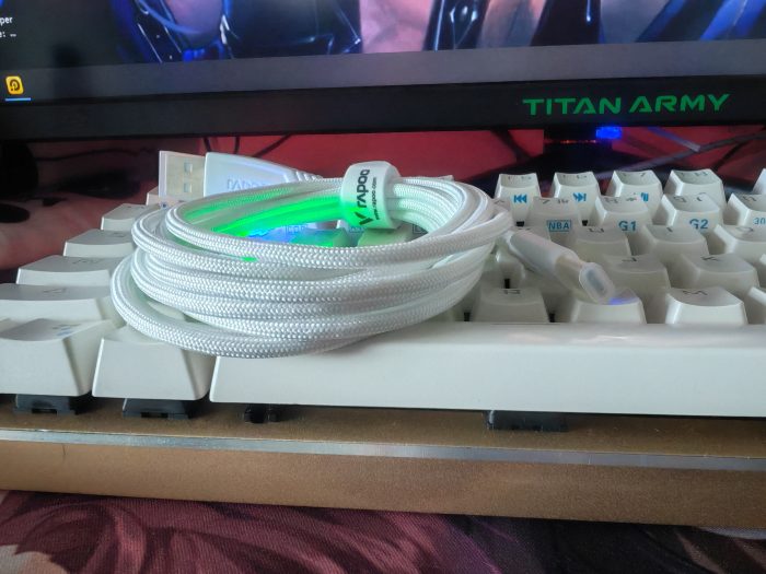 充电线也是白色的,我这一套雷柏VT3PRO MAX都是白色的,虽然白色好看,但是我更喜欢黑色,主打一个耐脏。毕竟作为电子外设设备,每天使用的情况下,还是耐脏一点更得我心。我还是比较喜欢雷柏VT3PRO MAX的充电线的,type-c接口就不说了,所有外设设备基本通用,但是在VT3PRO MAX的先是蛇纹线装的手感,比较柔和,最重要的是他还有个捆线扎带,能够让我的充电线随时随地都很整齐,看着都舒服好吗!