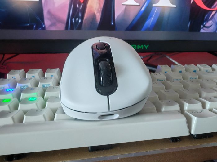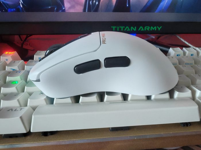 我的VT3PRO MAX鼠标是白色的,整个鼠标非常光滑,摸着很舒服。VT3PRO MAX的大小是中大型鼠标,对于手小的我来说稍微显得有点大,但是不妨碍使用。外观上来看,比较简洁大方,对比一下我的血手幽灵之后会发现,雷柏VT3PRO MAX的整个手握面设计真的是做到了极简啊!除了滚轮、左右键、LED显示灯和DIY键,就没有了!