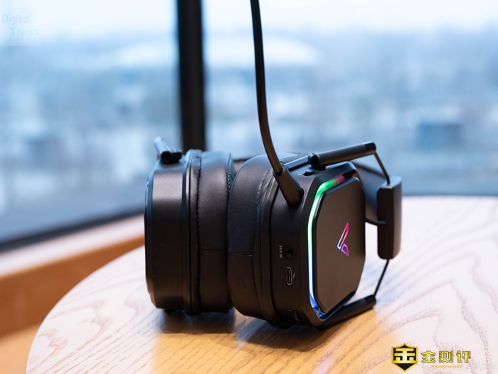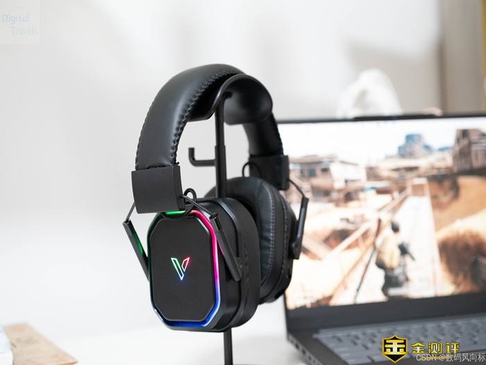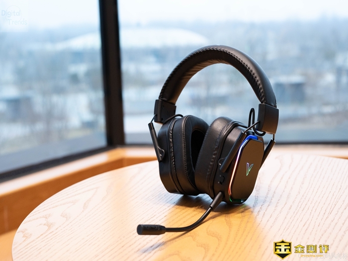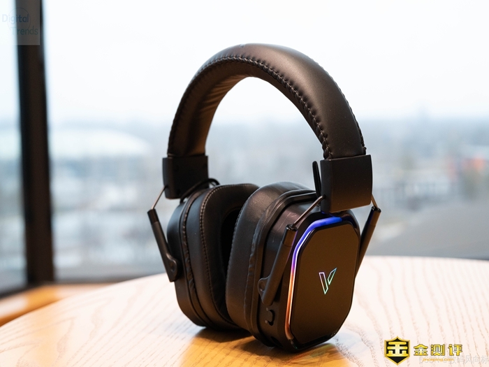 雷柏VH850的外观设计充满了电竞风格,整体质感出色,用料扎实,触感细腻。耳机的线条坚毅,造型风格孔武有力,给人一种强烈的视觉冲击。此外,耳机还配备了RGB灯效,耳罩外侧的隐藏式LED灯和V字Logo的RGB灯效在暗光环境下显得格外炫酷。灯效的显色均匀细腻,暗光环境下效果也很明显,黑暗的环境下灯效也不刺眼,既满足了玩家对炫酷灯效的追求,又兼顾了视觉舒适性。