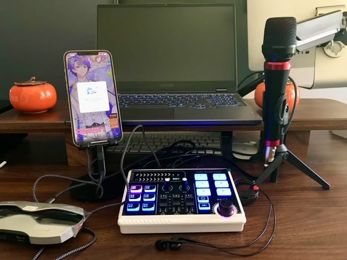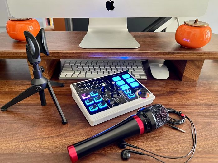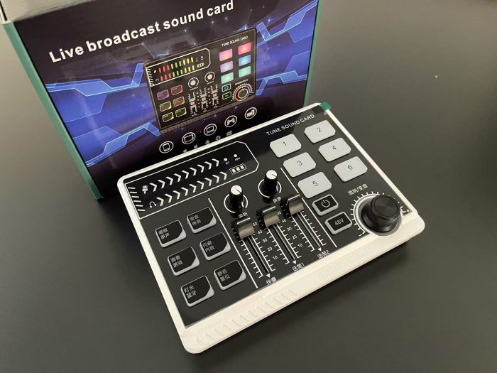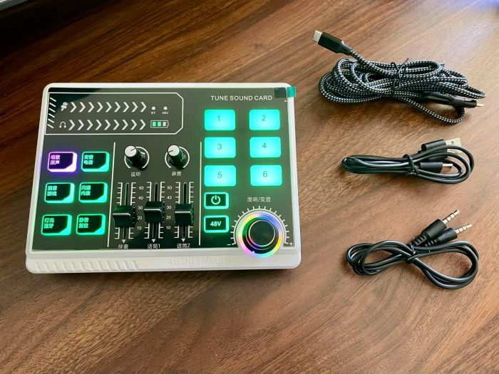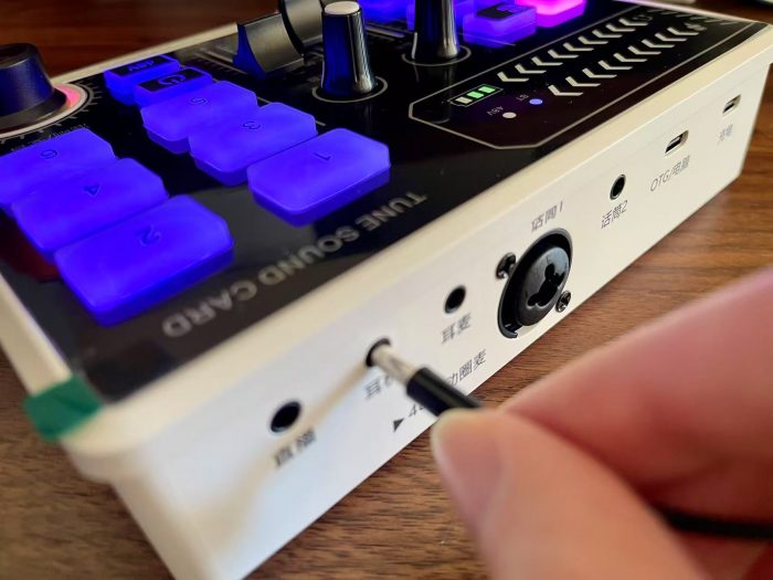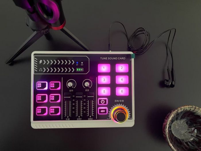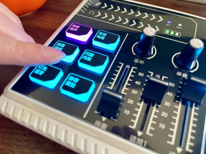 ▲ 按键设计非常简洁,操作也更简单。从左到右依次是状态显示区、功能调节区、音量调节区、快捷氛围音效、音效增益区! 搭配的麦克风也是48V电容麦,因为电压充足,具有更好的音质效果!