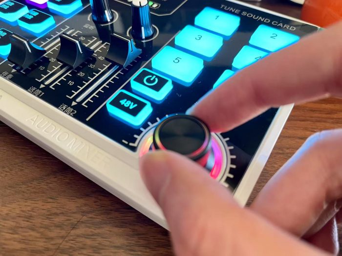 ▲ 一键增益调节旋钮,不再需要繁琐的参数调节,就可以轻松改变音色效果,非常适合爱唱歌又不擅长音色调节的直播小白使用!