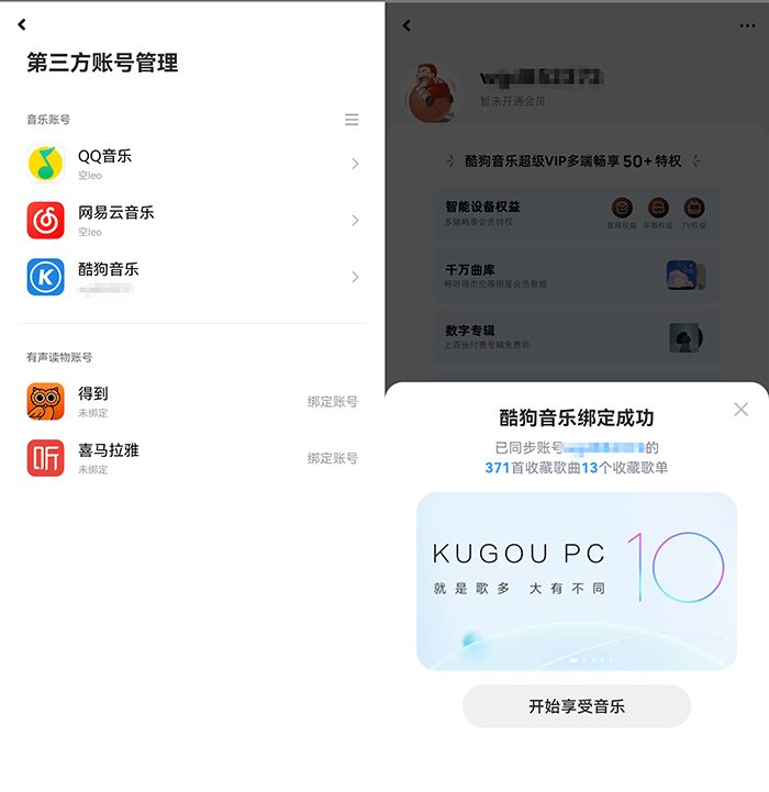 新一代小米智能音箱管理和前代无异,比如资源提供了5个源,包括QQ音乐、酷狗音乐、网易云音乐、得到、喜马拉雅,基本涵盖了当前资源最丰富的头部源。第三方账号都是需要购买会员才能够享受正常的音乐资源的,不同用户使用的APP不同,在小米音箱APP中也提供了排序操作,会优先搜索使用排序靠前的相关资源。