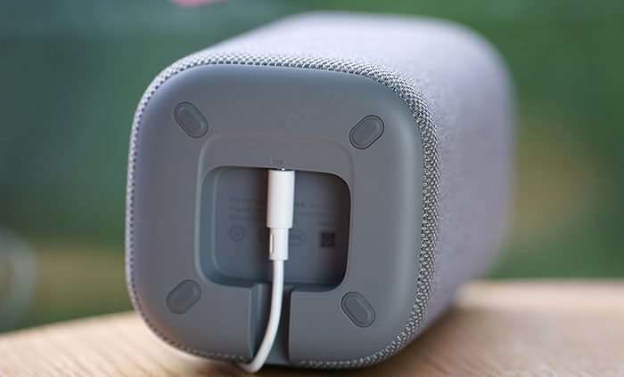 新一代小爱智能音箱底部也采用了凹槽式的设计,可以很好的隐藏电源线,并且在底部四角分别设计了四枚防滑脚垫,可以适应各种不同的使用环境。
