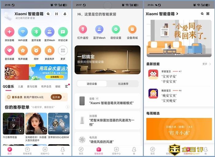 小米音箱手机APP的界面由首页、智能家居、技能中心和我4个界面组成。除了音乐体验外,小米智能音箱的技能也是非常丰富的。它有生活技能、儿童技能、对话体验、内容服务、智能家居和音箱设置等功能。我家里之前使用的是小米AI经典款音箱,在添加了小米智能音箱后,不需要再重新绑定就可以直接控制之前的智能产品了,使用起来也是非常方便的。