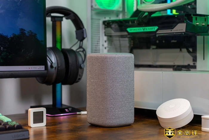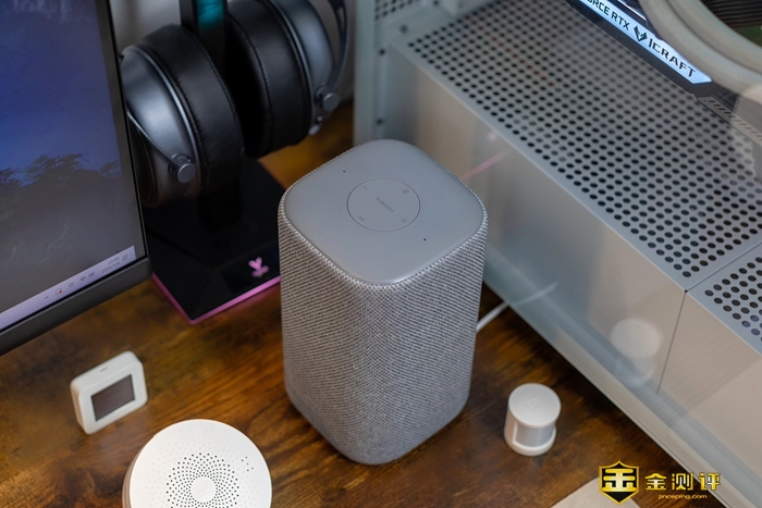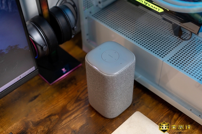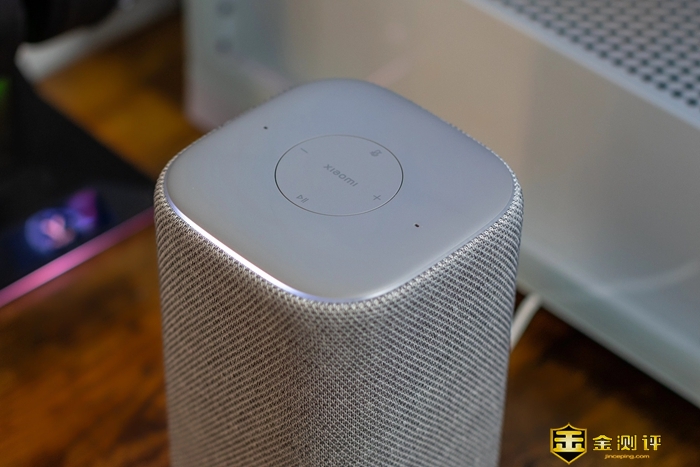 外观细节方面,小米智能音箱采用了云灰配色,整体圆润的外观造型,简约而不失时尚,和我家的极简风设计格调也很搭配。小米智能音箱的外观尺寸为97.4mm*97.4mm*172.5mm,机身四周由编织网布包覆,顶部4个功能按键触控灵敏,周边还设计了隐藏式氛围灯,在播放音乐时可以随着音乐旋律发出RGB炫彩光效,氛围感也是满满的。