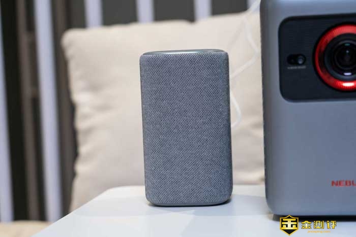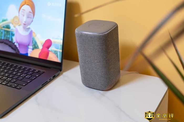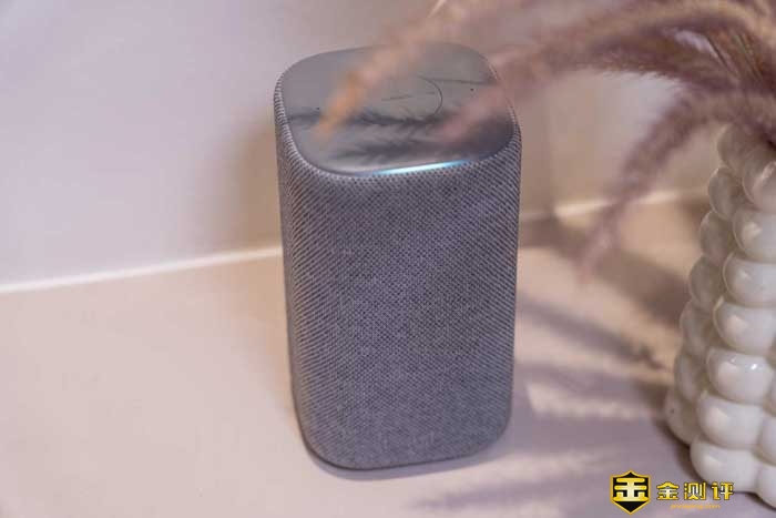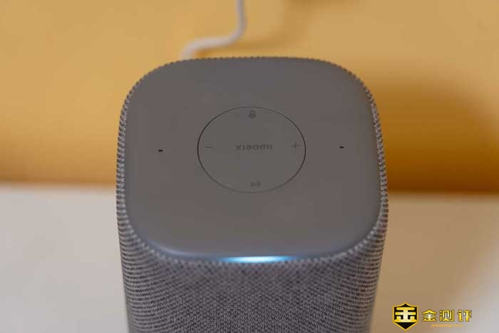 我们先来看看外观,小米智能音箱体积不大不小,刚好一个保温杯般的尺寸,它的四周包裹了一层网布的材质,让音箱看起来更加的有温度感,更温馨,而不是冷冰冰的塑料廉价感。这玩意放在家居里,不仅好看而且百搭。甚至还能提升家居的科技感。