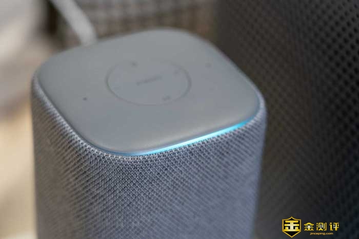 我们再来看看音箱的顶部,除了正面有半圈LED隐藏的炫彩指示灯,它可以通过不同的颜色和灯效来显示当前的工作状态。另外它的正面有多功能按键,同时两边还各有一颗MIC。