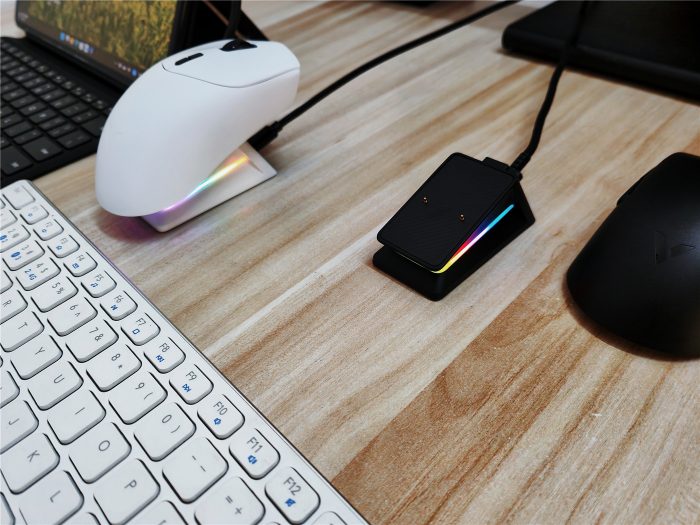 更重要的是,雷柏VT7系列支持无线/触点充电拓展,搭配P5触点充电底座,用户可以轻松摆脱有线充电的烦恼,充电过程更加便捷。P5充电底座还自带RGB幻彩灯光设计,不仅能够提升桌面氛围,还是一款充满科技感的配件。