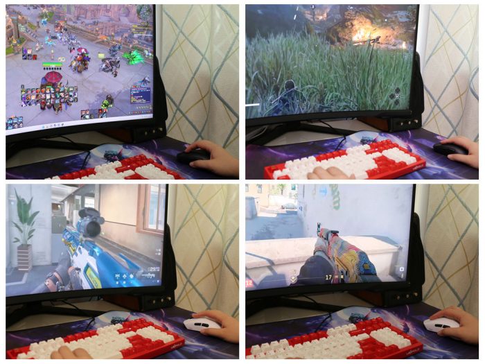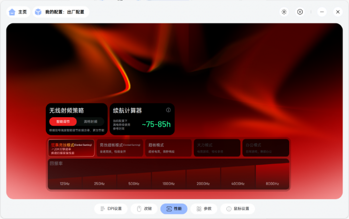 性能模式方面,提供了办公模式、火力模式、超核模式、竞技超核模式和狂暴竞技模式多种固件可选,(狂暴竞技模式仅 VT7 Max 支持)。不同模式代表了不同的引擎扫描速率,配合回报率设置,使得玩家可以在性能与续航之间找到平衡,例如在狂暴竞技模式下(≥20000FPS 静态急速扫描)2000Hz和8000Hz的续航分别为100h~110h和75~85h。