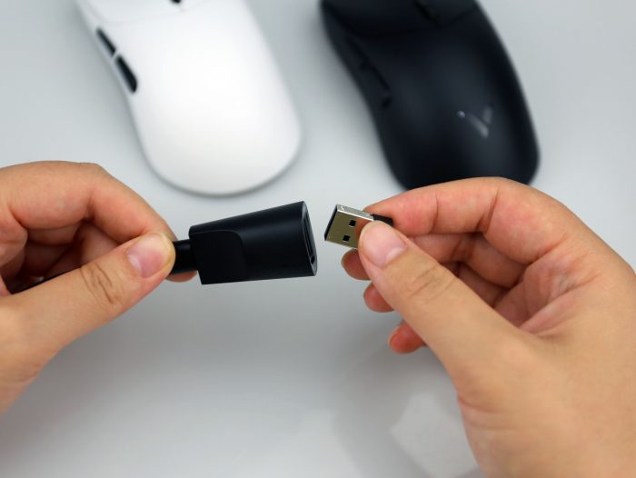 另外,这次雷柏 VT7系列还对这个USB转换器进行了全新的设计,可以看到它的外观更加圆润,充满了电竞感,它不但可以插入鼠标接收器有效减少信道干扰,还能接个U盘手机等外置存储设备方便办公存储资料。