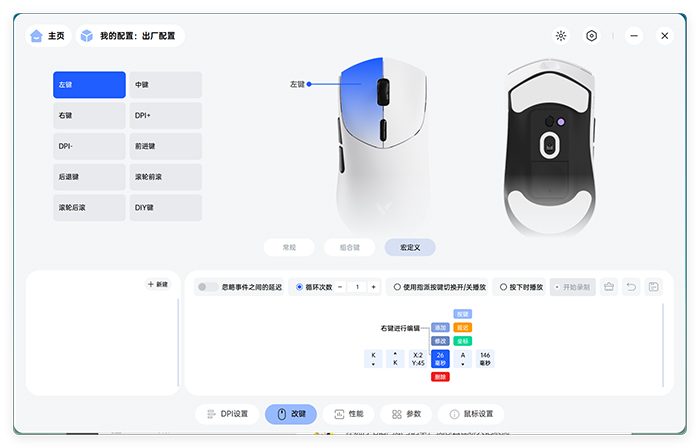 最基础的就是DPI设置,基于硬件配置,雷柏VT7提供了两种特色个性化配置:横轴X与纵轴Y独立设置,以50为单位的DPI精细化配置。在驱动中可以自定义7档DPI,范围为50—26000。