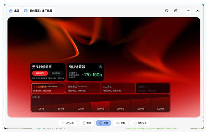 VT7的一个核心优势在于它可以在驱动中进行电竞模式配置,并且有3种不同的电竞模式提供选择——竞技超核模式(全速固件)、超核模式(竞技固件)、火力模式(游戏固件),根据不同的体验场景开放不同参数固件。在性能选择下,还可以自定义选择无线射频策略(智能调节和满格调节),并且驱动会根据当前工作模式提供一个续航时长以供参考。