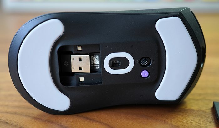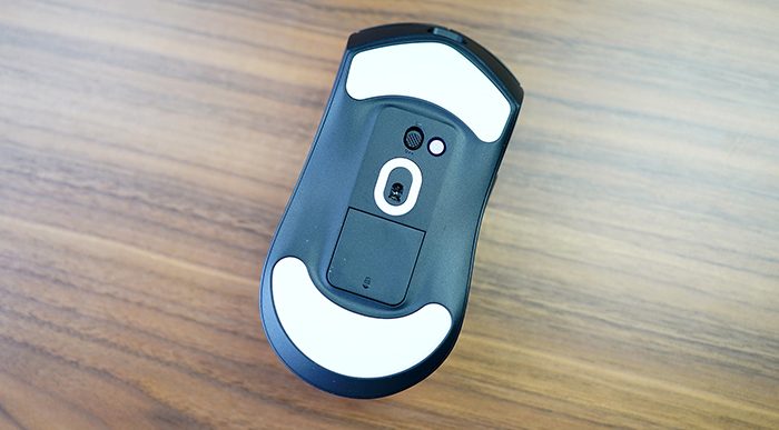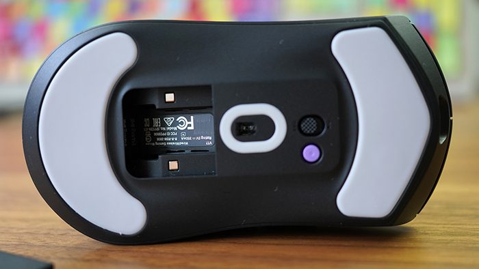 这里值得一提的是,VT7提供了自定义硬件模块,位于鼠标底部,有一个磁吸收纳仓,这个磁吸盖可以进行自定义配置,改成磁吸充电模块或者无线充电模块就可以改变VT7的补能方式,同时这个空间也可以把2.4G接收器收纳进去,减少了丢失的可能。