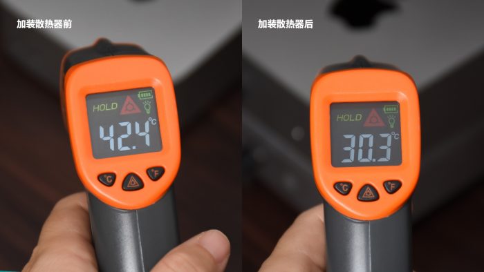 接着来测试一下韧能S9对于Macmini M4的散热有多大帮助。在不搭配散热器的情况下,运行CINEBENCH CPU测试,持续5分钟左右,机身温度彪高到42.4度。等机身稍凉下来以后,搭配上散热器再次运行同样的测试,5分钟之后机身表面温度只有30.3度,12度的温差充分说明韧能S9的散热能力相当出色。