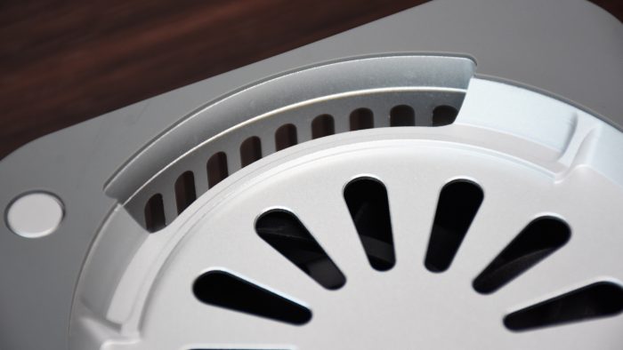 在散热器底部还加装了一个圆形的HEPA滤网,加之四个支撑脚将散热器抬高,和桌面之间留出缝隙。开启散热之后,通过风扇高速转动将外部的空气从底部吸入,经过滤网过滤掉灰尘颗粒物,再从顶部吹出,带动Macmini M4底部格栅排出的热风,引导加速从散热器背部的出风口排出。持续循环这个操作,就能起到辅助散热的作用,和单纯的靠风吹相比,这个风路设计更为巧妙。
