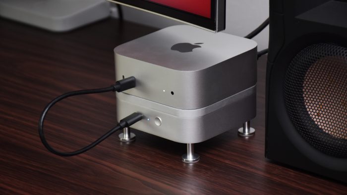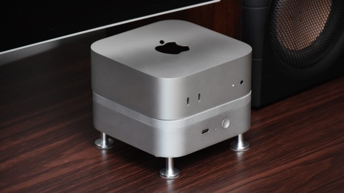 使用之前需要手动装上底部的四个支撑脚,也是和Mac Pro支撑脚相同的风格,保持整体的果味调性。再加上和Macmini M4相同的尺寸,搭配起来严丝合缝、浑然一体,完全不像是另外搭配的第三方配件。