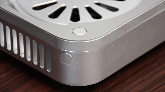 此外,韧能S9 M4 Macmini散热器的很多细节设计非常贴心。顶部周围专门加了一圈橡胶垫,既能避免刮伤电脑底部,又能增加阻尼放置更稳固。后方左侧设计了一个物理开关,从散热器背部按下就会顶起Macmini M4的开关,顺带解决了Macmini M4被吐槽最多的电源键位置不合理的问题。