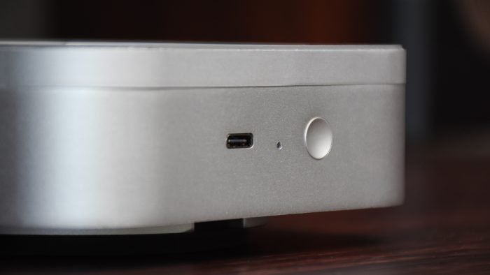 散热器的电源键和Type C接口都设计在机身前方,和Macmini M4直连就能供电,物理按键控制启停,方便操作。不过供电接口在前面会导致线材朝外,一定程度上会影响桌面整洁,建议后续版本可以像扩展坞那样改到机身后方。