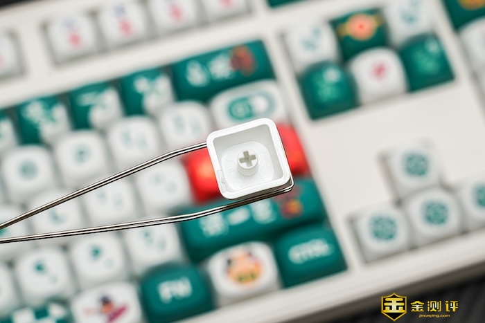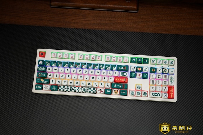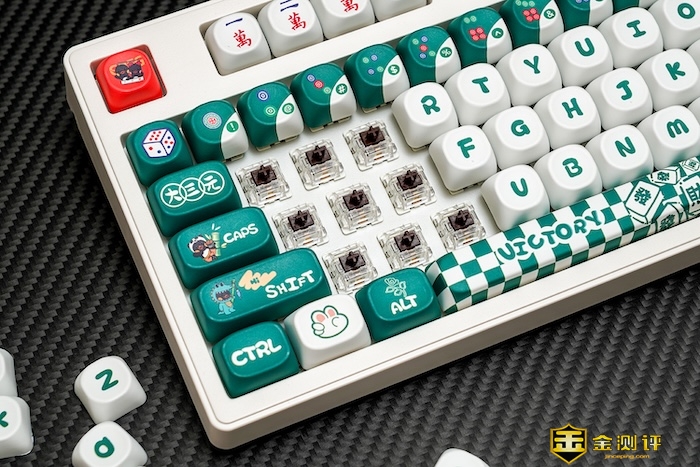 PBT材质键帽采用了五面热升华工艺,非常有质感,而且耐磨抗油,触感细腻,MOA高度,刻印图案清晰不易掉色,下方上圆造型加上红白绿配色,显示生动活泼,适合大多数浅色系桌搭。