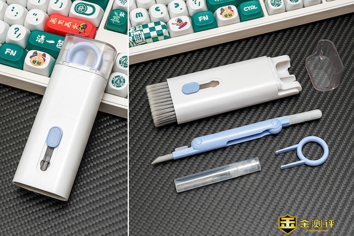 随机赠送一个7合1多功能清洁套装,包括拔键器、清洁刷、清洁液、清洁笔等,可以用来清洁键盘、显示器屏幕、手机缝隙、耳机仓等,非常实用。