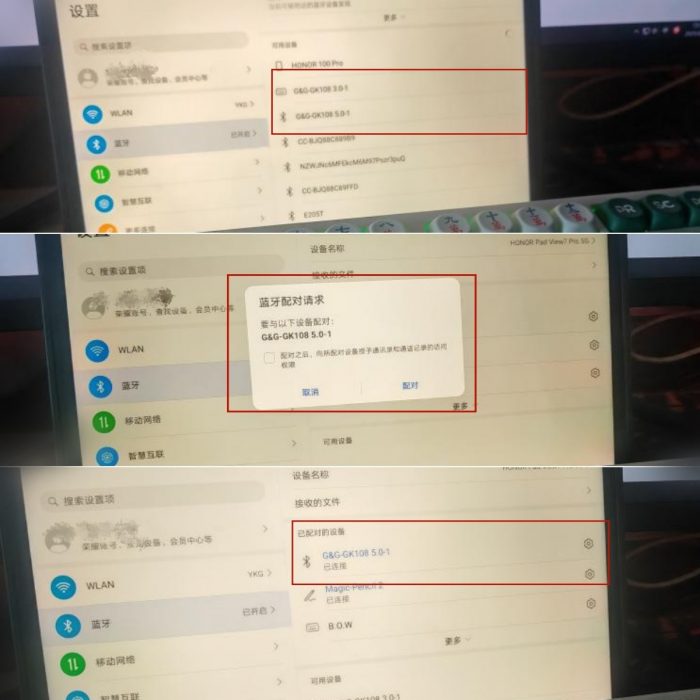 基本所有的蓝牙配对都是相同的招数:打开双方蓝牙→找到正确的蓝牙配对名称→点击等待配对→点击蓝牙配对请求(确认)→配对成功。当然了,因为这款格之格GK108是属于108键的大键盘,相对较重,所以更多的情况下我还是使用接收器连接电脑使用。毕竟平板偶尔带出去玩,这个键盘又重又大就有点不那么方便了。