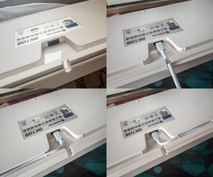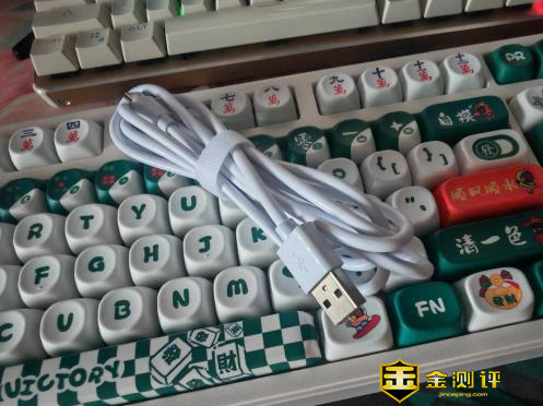 数据线是普通的TYPE-C数据线,USB一头连接电脑,type-c一头连接键盘即可。有线使用的情况下,数据线就是连接线,无线使用的情况下,数据线则是充电线,负责给格之格GK108三模机械键盘充电。这里需要提示一下,有线连接完毕之后,需要FN+5打开有线模式键盘才能使用,否则就只是给键盘充电咯!