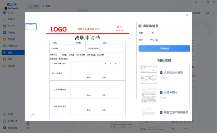 第三个方面就是这款格之格GK96 AI语音键盘内置了多种模块,比如,大家最最常用的离职申请书,我们牛马人想最后硬气一会,在网上找了许多模版,就是不能下载,是不是感觉太失败了。有了这款智能语音键盘,日常想要的各种模板,随便下载使用。太方便不过了。