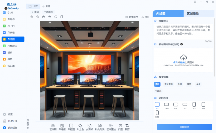 第四个功能也是我工作中刚好碰到的,由于我们工作需求,需要给客户设计一张演示厅渲染效果,刚好用这款格之格GK96 AI语音键盘进行AI绘图,里面有多种尺寸以及风格可以供选择,真的是大大的提高了我的工作效率,当然最重要是竟然还可以AI PPT: