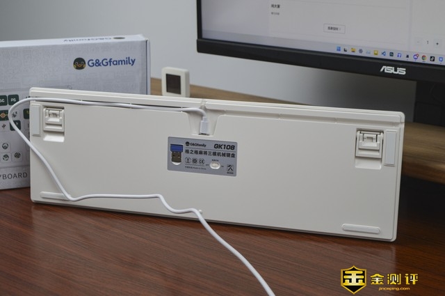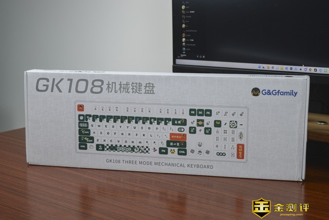 这款GK108无线三模机械键盘包装比较简约,除了产品简笔拓印、品牌logo、型号系列名等信息外别无冗余。