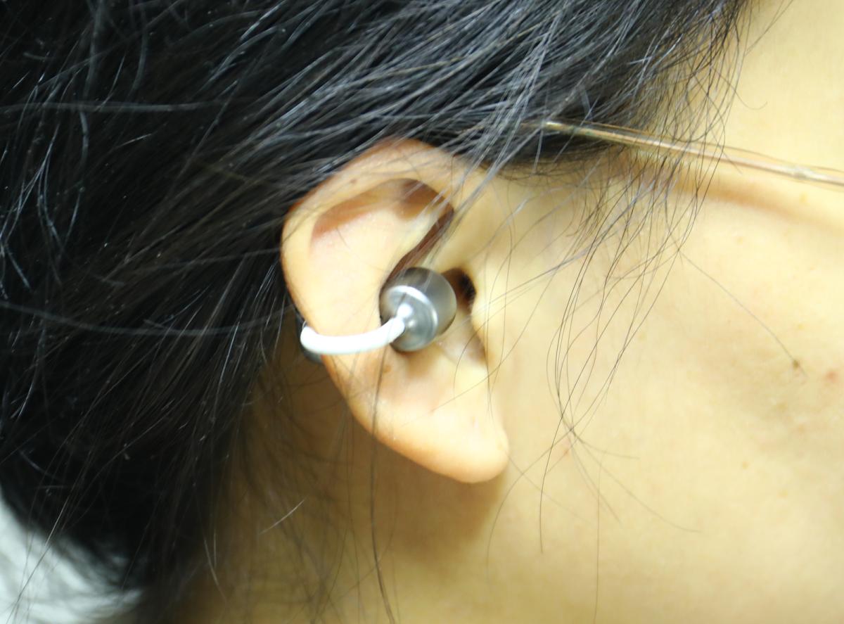 作为耳夹式耳机的核心竞争力,虹觅Clip Pro在佩戴设计上堪称“教科书级别”。它创新性采用“∠12弧面耳托+2.5mm错位设计”,彻底解决了传统耳夹耳机“夹耳痛”“易脱落”的两难问题。2.5mm错位设计让耳机呈现“前高后低”的布局,精准模拟耳廓自然弧度,佩戴时耳机并非生硬“怼”在耳背上,而是像“嵌”在耳廓里一样贴合;∠12弧面耳托则将压力均匀分散到整个耳背接触面上,避免单点压迫导致的胀痛感,即便长时间佩戴也毫无负担。