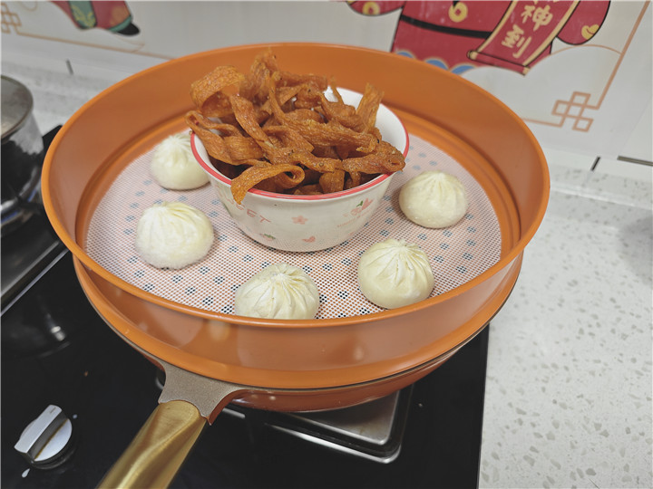 同时我自己不会下厨的人都可以用它来做简单的饭菜,比如,早上为家里的宝宝蒸包子和辣条(辣条是昨天媳妇做好的)第二天想吃了直接在帝伯朗炒锅自带的蒸格热一下即可,非常方便,而且除了蒸包子以外,还可以进行煎蛋,在煎蛋过程中,不粘效果表现出色,即使不使用铲子频繁翻动,鸡蛋也能轻松在锅中滑动。这应该是我有史以来做的最好的一次煎蛋,哇哈哈。