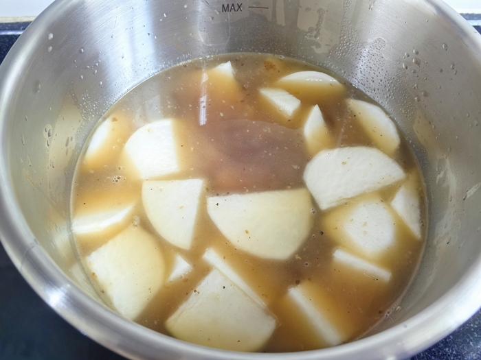 根据说明书,安全泄气阀稳定排气后改为小火,继续大约12分钟左右,开锅。一份美味可口的排骨萝卜汤就炖好了。整个过程安全又省心。