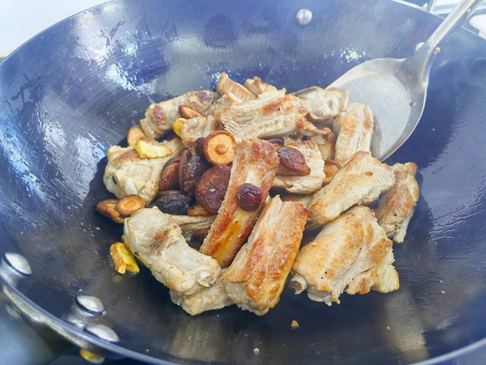 先将排骨过过水,少油干炒一下。入锅,加水。